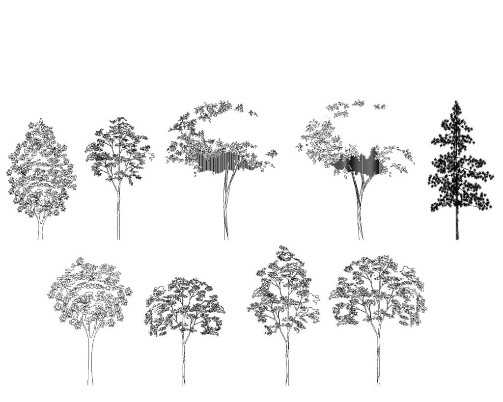 Download this detailed tree elevation free dwg to add realistic foliage to your architectural sections. This 2D CAD drawing features a large collection of ten different trees, drawn with fine line work to clearly show individual leaves and complex branch structures.