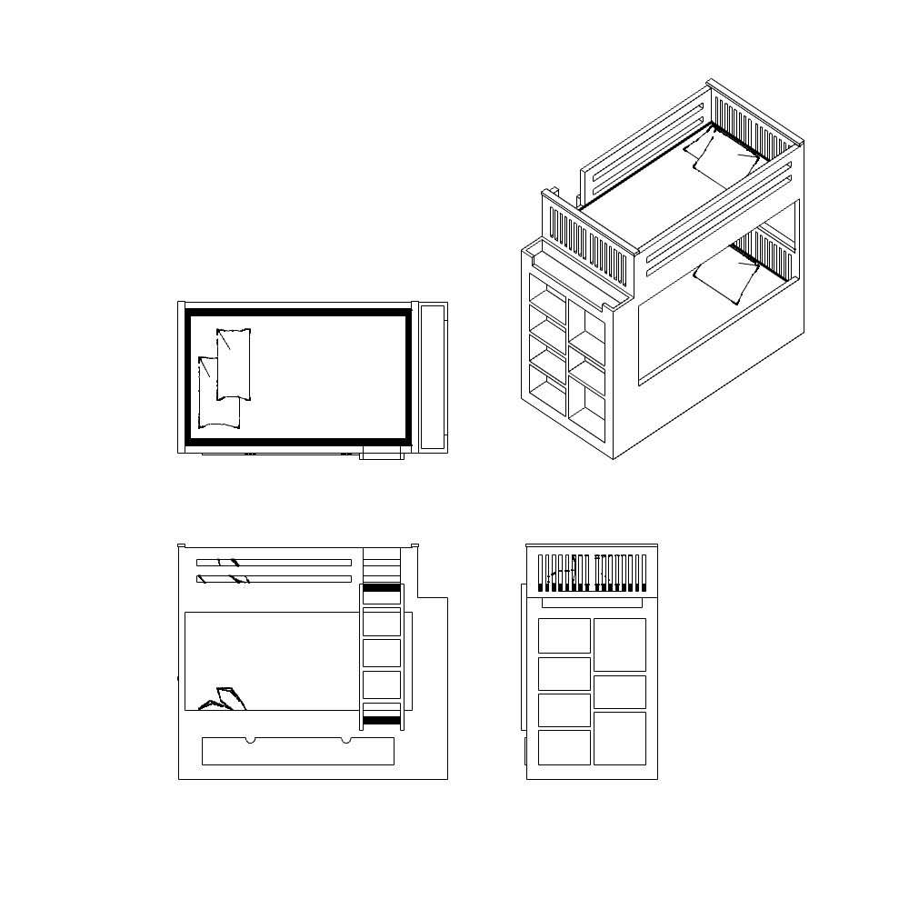 Download this free bunk bed dwg for your residential children’s bedroom floor plans. This 2D CAD drawing shows a two-tier bed frame with a built-in ladder and under-bed storage drawers, ready to place directly into your project.