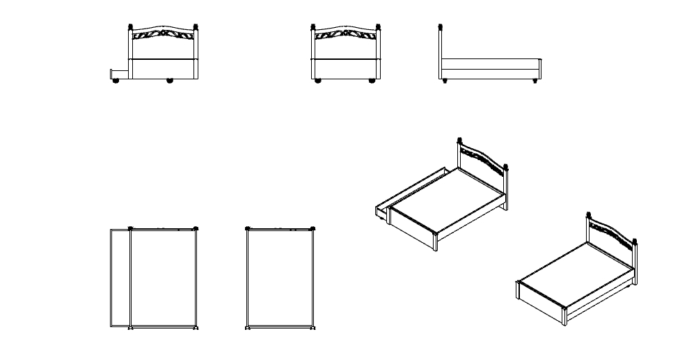 Download this free double bed dwg for your bedroom floor plans. This 2D CAD drawing shows a bed frame with a patterned headboard and a pull-out storage drawer. It includes multiple views to help you document your interior layouts clearly. The file is clean, properly scaled, and ready to drop right into your architectural projects.