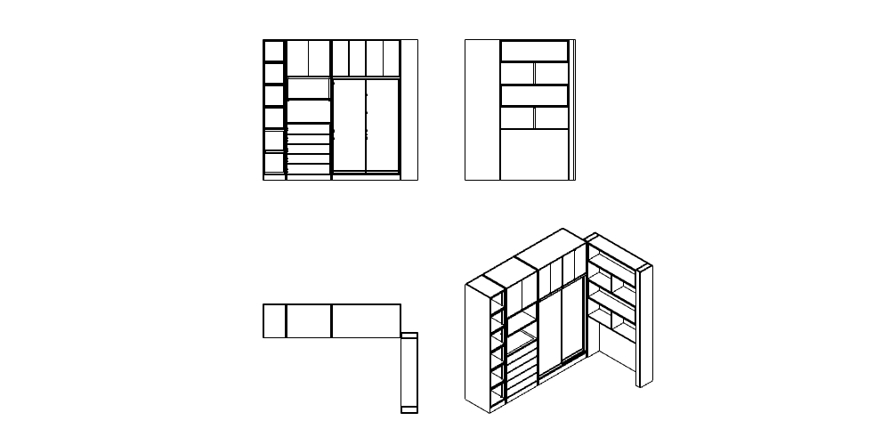 Download this free l-shaped wardrobe dwg for your bedroom and walk-in closet floor plans. This 2D CAD drawing shows a detailed storage system with shelves, drawers, and hanging sections, making it easy to detail your interior elevations.