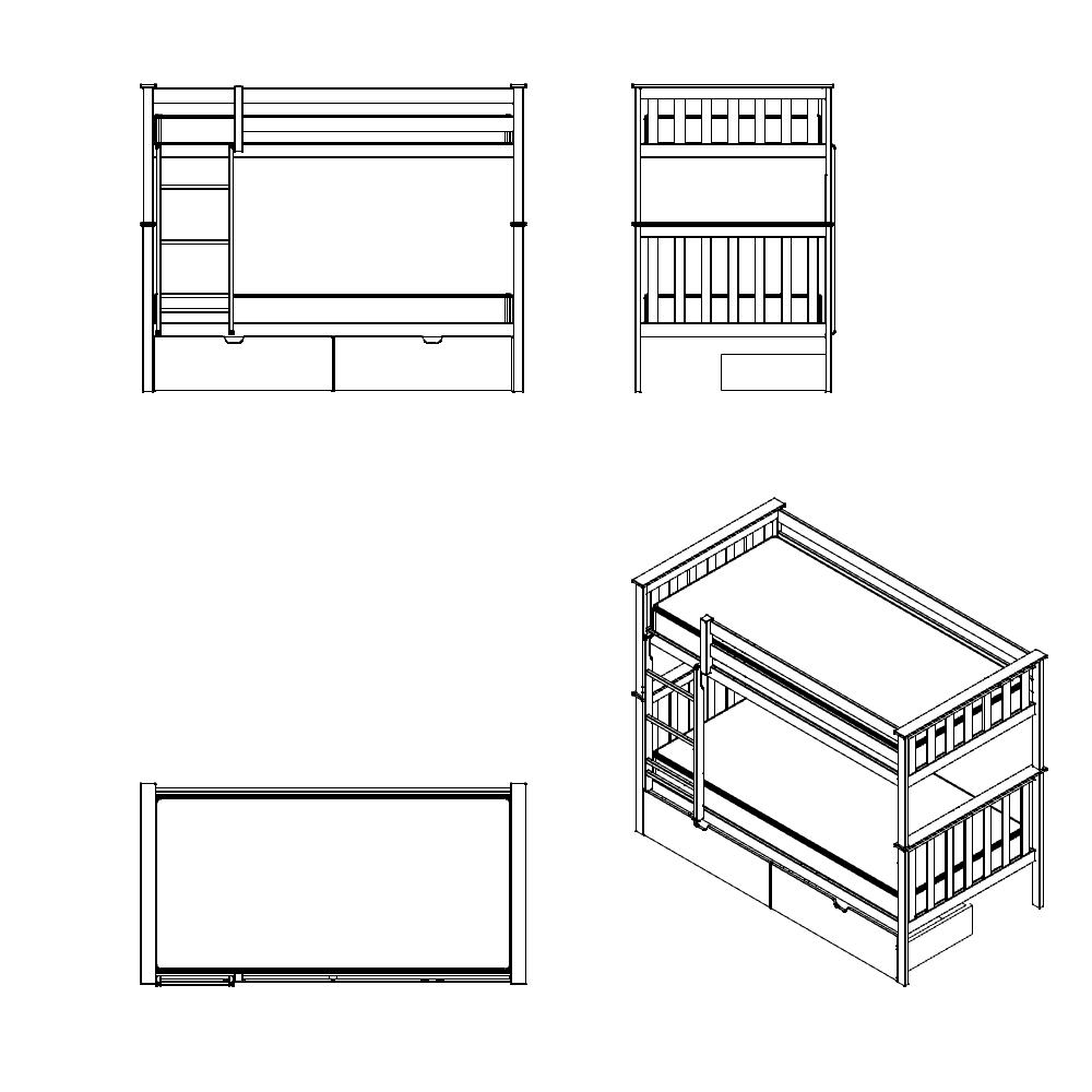 A: This file includes a top plan view, front and side elevations, and a 3D isometric view. You can use these to show the bed in both floor plans and room sections.