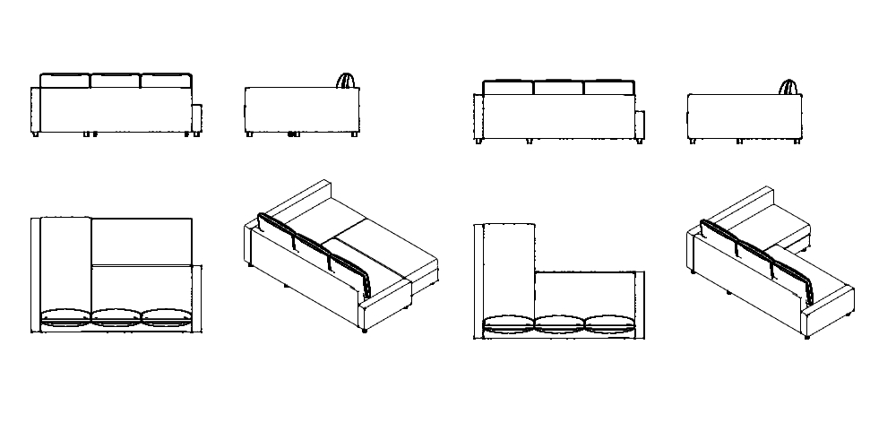 A: This 2D CAD drawing shows the sofa in two different states. You get views of it as a standard L-shaped sectional sofa, and also pulled out as a flat bed.
